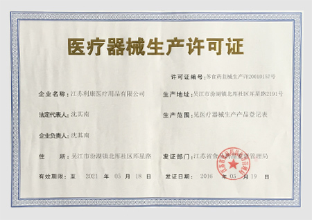 醫療器(qì)械生產企業許可證(編號:蘇食藥(yào)監械生產許2001-0157號)
