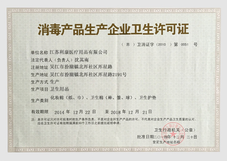 消毒產品生產企業(yè)衛生許可證(編號:(蘇)衛消證字(2010)第0051號)